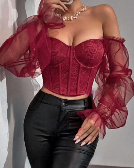 Top avec tulle à manche évasée court en dentelle